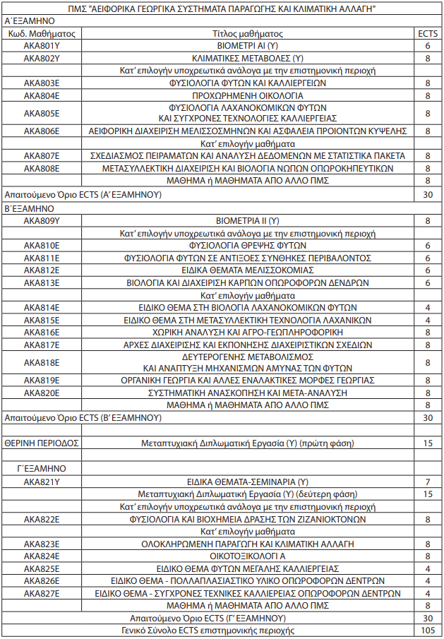 - Το ΠΜΣ «Αειφορικά Γεωργικά Συστήματα Παραγωγής και Κλιματική Αλλαγή» αποσκοπεί στην προαγωγή της Αειφόρου Γεωργικής Παραγωγής σε ένα περιβάλλον με συνεχώς μεταβαλλόμενες κλιματικές συνθήκες. Το ΠΜΣ παρέχει στους φοιτητές βασικές επιστημονικές αρχές και ολοκληρωμένες γνώσεις και μεθόδους που τους καθιστούν ικανούς επιστήμονες για τη δημιουργία νέας γνώσης, η εφαρμογή της οποίας έχει άμεση επίδραση στον αειφορικό σχεδιασμό και διαχείριση των γεωργικών συστημάτων παραγωγής λαμβάνοντας υπόψη τις μεταβαλλόμενες κλιματικές συνθήκες και τα ακραία καιρικά φαινόμενα. - Ο σκοπός του εντατικού ΠΜΣ “Αειφορικά Γεωργικά Συστήματα Παραγωγής και Κλιματική Αλλαγή” αναλύεται ως εξής: α) Εξειδίκευση επιστημόνων στο σχεδιασμό της Αειφόρου Γεωργικής Παραγωγής σε περιβάλλοντα με συνεχώς μεταβαλλόμενες κλιματικές συνθήκες. β) Ενίσχυση της έρευνας στο ανωτέρω αντικείμενο στη χώρα που θα συμβάλλει τόσο στην ανάπτυξη νέας τεχνολογίας όσο και στη στήριξη του έργου των επιστημόνων που δραστηριοποιούνται στο αντικείμενο αυτό. γ) Κάλυψη των αναγκών σε επιστήμονες που είναι απαραίτητοι στη στελέχωση του δημοσίου και του ιδιωτικού τομέα στο εν λόγω αντικείμενο. δ) Κάλυψη των αναγκών σε επιστήμονες για τη στελέχωση των Εκπαιδευτικών Ιδρυμάτων και Διεθνών Οργανισμών. ε) Κατάρτιση στο αντικείμενο επιστημόνων που θα προέρχονται από άλλες χώρες. - Αναλυτικά η τελευταία προκήρυξη:- Το Τμήμα Γεωπονίας του ΑΠΘ θα λειτουργήσει για το ακαδημαϊκό έτος 2020-2021 Πρόγραμμα Μεταπτυχιακών Σπουδών (ΠΜΣ) που οδηγεί στην απόκτηση Μεταπτυχιακού Διπλώματος (ΜΔ) με τίτλο: “ΑΕΙΦΟΡΙΚΑ ΓΕΩΡΓΙΚΑ ΣΥΣΤΗΜΑΤΑ ΠΑΡΑΓΩΓΗΣ ΚΑΙ ΚΛΙΜΑΤΙΚΗ ΑΛΛΑΓΗ” (ΦΕΚ τ.Β’ 3834/06-09-2018). Το ΠΜΣ δίνει έμφαση στις ακόλουθες θεματικές επιστημονικές περιοχές: Ανθοκομία, ΒιομετρίαΑνάλυση Δεδομένων και Γεωργικός Πειραματισμός, Γεωργία, Δενδροκομία, Λαχανοκομία, Μελισσοκομία, Οικολογία και Προστασία Περιβάλλοντος και Φυσιολογία-Οικοφυσιολογία. - Η χρονική διάρκεια φοίτησης στο ΠΜΣ είναι τρία (3) εξάμηνα συμπεριλαμβανομένης και της εκπόνησης και της αξιολόγησης της Μεταπτυχιακής Διπλωματικής Εργασίας. Κάθε εξάμηνο θα περιλαμβάνει τουλάχιστον 13 εβδομάδες διαλέξεων. Η παρακολούθηση των μαθημάτων και η συμμετοχή στις κάθε είδους εκπαιδευτικές δραστηριότητες, όπως εργασίες, εργαστήρια, σεμινάρια, ημερίδες κ.λπ., είναι υποχρεωτική. Η γλώσσα διδασκαλίας είναι η Ελληνική. Ο ανώτατος επιτρεπόμενος χρόνος ολοκλήρωσης των σπουδών είναι τα πέντε (5) εξάμηνα. - Η έναρξη των μαθημάτων θα πραγματοποιηθεί το πρώτο δεκαήμερο του Οκτωβρίου του 2020 και η ολοκλήρωση του Προγράμματος θα γίνει τον Φεβρουάριο του 2022. - Η χρονική διάρκεια για την απονομή του Διπλώματος Μεταπτυχιακών Σπουδών (ΔΜΣ) ορίζεται σε τρία (3) εξάμηνα (τουλάχιστον 105 ECTS), με εκπόνηση διπλωματικής εργασίας που αρχίζει από τα μέσα του πρώτου εξαμήνου. - Δεκτοί γίνονται κάτοχοι τίτλου πρώτου κύκλου σπουδών Τμημάτων Γεωπονίας, Δασολογίας και Φυσικού Περιβάλλοντος, Βιολογίας, Κτηνιατρικής, Θετικών Επιστημών και πτυχιούχοι Τμημάτων ΑΕΙ συναφών με τις θεματικές επιστημονικές περιοχές του ΠΜΣ (Ανθοκομία, Βιομετρία-Ανάλυση Δεδομένων και Γεωργικός Πειραματισμός, Γεωργία, Δενδροκομία, Λαχανοκομία, Μελισσοκομία, Οικολογία και Προστασία Περιβάλλοντος και Φυσιολογία-Οικοφυσιολογία), της ημεδαπής ή ομοταγών Ιδρυμάτων της αλλοδαπής και πτυχιούχοι ΑΕΙ σχετικών