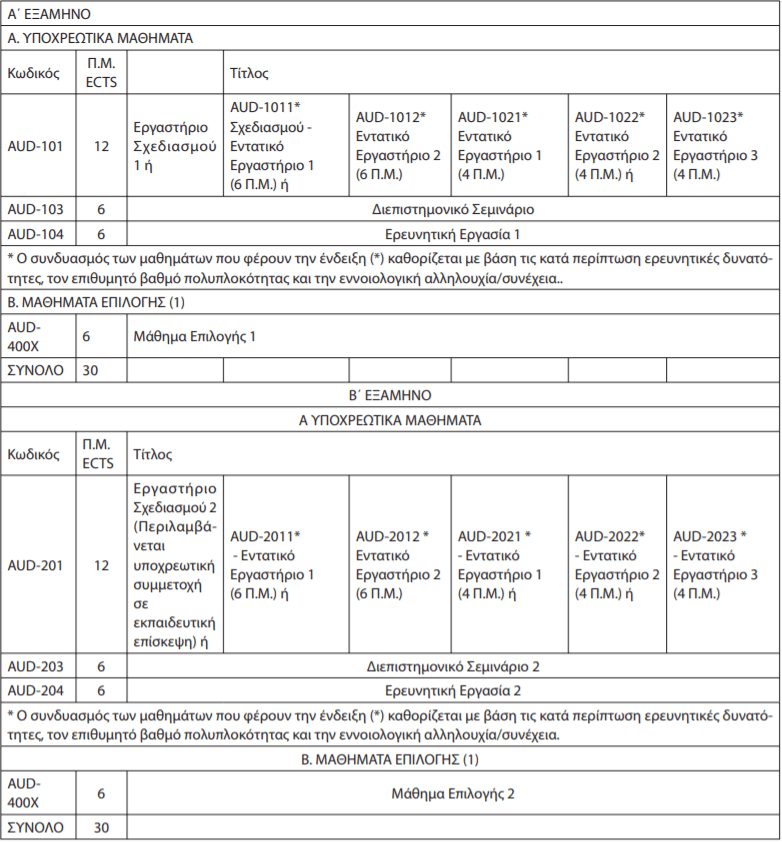 Το σύνολο των Πιστωτικών Μονάδων (ECTS) που απαιτούνται για την απόκτηση του Δ.Μ.Σ. ανέρχεται σε εβδομήντα πέντε (75). Τα μαθήματα του Π.Μ.Σ. είναι εξαμηνιαία, ενώ το Ολοκληρωμένο Εργαστήριο Σχεδιασμού τριμηνιαίο (θερινή περίοδος).