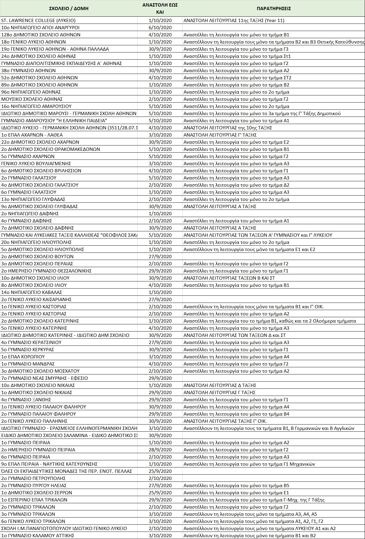 Υπενθυμίζεται ότι βάσει πρωτοκόλλου του ΕΟΔΥ, σε περίπτωση κρούσματος επιβάλλεται η αναστολή λειτουργίας για 14 ημέρες, ενώ για την αναστολή λειτουργίας σχολικής μονάδας απαιτείται ο εντοπισμός τουλάχιστον τριών κρουσμάτων, μη άμεσα συσχετιζόμενων μεταξύ τους.