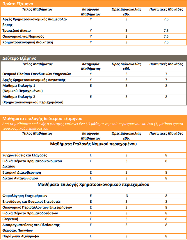(γ) ότι ήδη στο περιεχόμενο των περισσοτέρων μαθημάτων του προγράμματος περιλαμβάνεται η εκπόνηση ομαδικών ή ατομικών εργασιών και παρουσιάσεων στο πλαίσιο της διδασκαλίας και παρακολούθησης, κρίνεται ότι η εκπόνηση διπλωματικής εργασίας έχει αντικατασταθεί πλήρως και ισοδυνάμως με τον πλέον πρόσφορο επιστημονικό τρόπο.Το πρώτο εξάμηνο περιλαμβάνει τέσσερα (4) μαθήματα τα οποία είναι κοινά για όλους τους φοιτητές. Το δεύτερο εξάμηνο περιλαμβάνει τέσσερα (4) μαθήματα. Από αυτά τα τέσσερα (4) μαθήματα, δυο (2) είναι υποχρεωτικού χαρακτήρα και τα υπόλοιπα δύο (2) μαθήματα είναι μαθήματα επιλογής, και ειδικότερα, ένα (1) είναι μάθημα επιλογής και χρηματοοικονομικού περιεχομένου και ένα (1) είναι μάθημα επιλογής και νομικού περιεχομένου.
