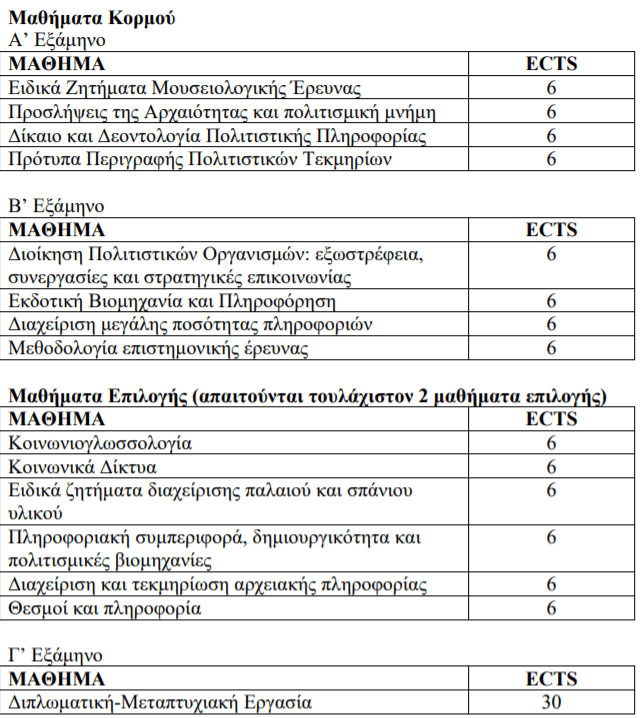 εφαρμοσμένης γνώσης για την ανάδειξη των τεκμηρίων και τη διοίκηση πολιτιστικών μονάδων/οργανισμών (αρχεία, βιβλιοθήκες, μουσεία, εκδοτικοί οίκοι και άλλοι οργανισμοί).- Δείτε αναλυτικά την Προκήρυξη:- Το Τμήμα Αρχειονομίας, Βιβλιοθηκονομίας και Μουσειολογίας του Ιονίου Πανεπιστημίου, προσκαλεί όσους ενδιαφέρονται να υποβάλουν αίτηση για την ένταξή τους κατά το ακαδημαϊκό έτος 2020-2021 στο Πρόγραμμα Μεταπτυχιακών Σπουδών (ΠΜΣ) «Διαχείριση και Ανάδειξη Πολιτιστικής Πληροφορίας», το οποίο οδηγεί σε Μεταπτυχιακό Δίπλωμα Ειδίκευσης (ΜΔΕ). - Το Πρόγραμμα Μεταπτυχιακών Σπουδών (ΠΜΣ) έχει ως αντικείμενο την διαχείριση και ανάδειξη της Πολιτιστικής Πληροφορίας -μέσω προσεγγίσεων κυρίως κοινωνικών και ανθρωπιστικών επιστημών- καθ’ όλο τον κύκλο ζωής της: από τη δημιουργία και την παραγωγή της μέχρι την περιγραφή, διακίνηση, οργάνωση και ιδιαίτερα την ανάδειξή της μέσω της διαμόρφωσης υπηρεσιών με βάση αυτή (αρχεία, βιβλιοθήκες, μουσεία, εκδοτικοί οίκοι και άλλοι οργανισμοί). - Σκοπός του ΠΜΣ είναι η κατάρτιση επιστημόνων και ερευνητών υψηλής ειδίκευσης στο γνωστικό πεδίο της Διαχείρισης και Ανάδειξης Πολιτιστικής Πληροφορίας και η παροχή εξειδικευμένης θεωρητικής και ερευνητικής γνώσης για τον ορισμό, την ανάλυση, την ερμηνεία, τη διαχείριση, την αξιολόγηση και τη διακίνηση της Πολιτιστικής Πληροφορίας, καθώς και η παροχή εξειδικευμένης πρακτικής, εμπειρικής και εφαρμοσμένης γνώσης για την ανάδειξη των τεκμηρίων και τη διοίκηση πολιτιστικών μονάδων/οργανισμών (αρχεία, βιβλιοθήκες, μουσεία, εκδοτικοί οίκοι και άλλοι οργανισμοί). - Η συνολική διάρκεια των σπουδών ορίζεται σε 3 (τρία) ακαδημαϊκά εξάμηνα, από τα οποία τα δύο συνιστούν υποχρεωτική εκπαιδευτική παρακολούθηση και το τρίτο περιλαμβάνει εκπόνηση Διπλωματικής Εργασίας. - Το σύνολο των Πιστωτικών Μονάδων (ECTS), που απαιτούνται για την απόκτηση Δ.Μ.Σ., ανέρχεται σε 90 ECTS μονάδες. Τα μαθήματα λαμβάνουν την μορφή σεμιναριακών διαλέξεων με υποχρεωτική για τους φοιτητές παρακολούθηση και διακρίνονται σε μαθήματα κορμού και μαθήματα κατ’ επιλογήν. - Στο ΠΜΣ θα γίνονται δεκτοί κάτοχοι τίτλου πρώτου κύκλου σπουδών Α.Ε.Ι. της ημεδαπής ή αναγνωρισμένων ομοταγών ιδρυμάτων της αλλοδαπής σύμφωνα με τις διατάξεις του άρθρου 34 του ν. 4485/2017, καθώς και πτυχιούχοι Τμημάτων ΤΕΙ συναφούς γνωστικού αντικειμένου. - Προτεραιότητα δίδεται σε πτυχιούχους : Α. Τμήματος Αρχειονομίας, Βιβλιοθηκονομίας και Μουσειολογίας, Β. Φιλοσοφικών Σχολών, Γ. Νομικών Σχολών, Δ. Διοίκησης και Οικονομίας, Ε. ΑΣΚΤ, Τεχνών Ήχου και Εικόνας, Μουσικών Σπουδών, ΣΤ. Πληροφορικής, Ζ. Παιδαγωγικών Σχολών Πανεπιστημίων της ημεδαπής, καθώς και αναγνωρισμένων ομοταγών ιδρυμάτων της αλλοδαπής, όπως και πτυχιούχοι Τμημάτων ΤΕΙ συναφούς γνωστικού αντικειμένου. - Το ακαδημαϊκό έτος 2020-2021 προκηρύσσονται είκοσι (20) θέσεις στο Μεταπτυχιακό Πρόγραμμα Σπουδών“Διαχείριση και Ανάδειξη Πολιτιστικής Πληροφορίας”. - Οι υποψήφιοι θα εξεταστούν γραπτά κατά το μήνα Σεπτέμβριο 2020 στο ακόλουθο μάθημα: Πληροφορία και Πολιτισμός - Eξεταστέα ύλη – Βιβλιογραφία: - Μπώκος Γ. (2001), Εισαγωγή στην Επιστήμη της Πληροφόρησης», Αθήνα: Εκδόσεις Παπασωτηρίου, κεφάλαια 1,2,3,4,8.