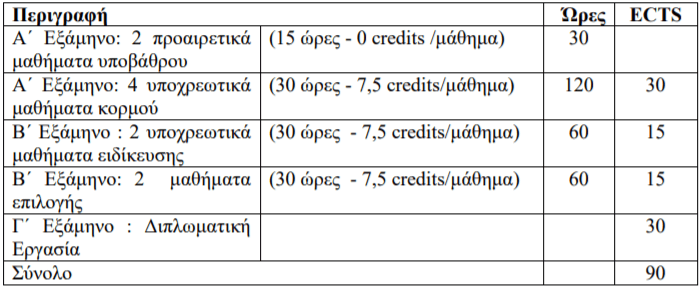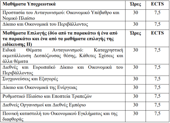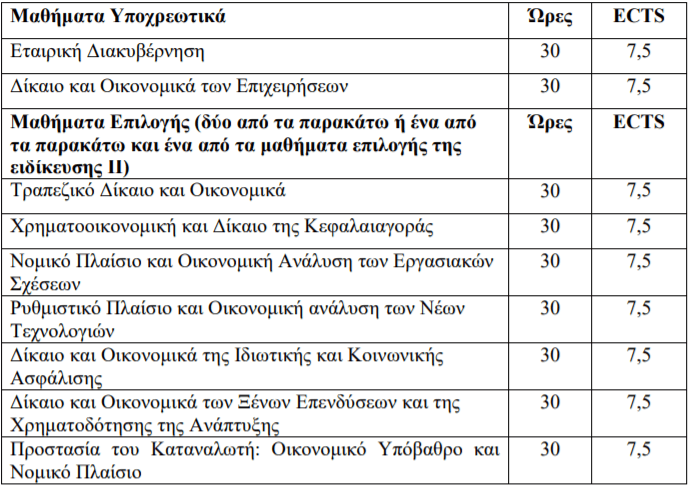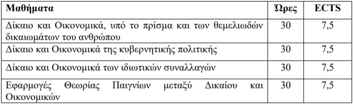 - Το Δ.Π.Μ.Σ. «Δίκαιο και Οικονομικά» διαρθρώνεται σε τρία (3) ακαδημαϊκά εξάμηνα. - Στο Α΄ εξάμηνο διδάσκονται τα δύο προαιρετικά Μαθήματα Υποβάθρου και τα τέσσερα Υποχρεωτικά Μαθήματα Κορμού (κοινά για όλες τις ειδικεύσεις). - Στο Β΄ εξάμηνο διδάσκονται δύο υποχρεωτικά μαθήματα και δύο μαθήματα επιλογής για κάθε ειδίκευση. Ο ορισμός των κατ’ επιλογή μαθημάτων γίνεται με βάση την διαθεσιμότητα διδασκόντων κατ’ έτος και τις επιλογές των φοιτητών. - Στο Γ΄ εξάμηνο οι φοιτητές εκπονούν τη Μεταπτυχιακή Διπλωματική Εργασία. - Επειδή το πρόγραμμα απευθύνεται σε ακροατήριο με διαφορετικό ακαδημαϊκό υπόβαθρο, των μαθημάτων κορμού του Α΄ εξαμήνου προηγούνται δύο προαιρετικά μαθήματα υποβάθρου, που στόχο έχουν να προσφέρουν στους μεταπτυχιακούς φοιτητές τις απαραίτητες βασικές γνώσεις και ορολογία ώστε να μπορούν να παρακολουθήσουν απρόσκοπτα τα μαθήματα του προγράμματος. Τα μαθήματα αυτά καλύπτουν 1) την Εισαγωγή στα Οικονομικά και 2) την Εισαγωγή στο Δίκαιο. Η παρακολούθηση των μαθημάτων αυτών δεν είναι υποχρεωτική. - Ο παρακάτω Πίνακας παρουσιάζει τις ώρες διδασκαλίας και τις ακαδημαϊκές πιστωτικές μονάδες ανά μάθημα και στο σύνολο του προγράμματος.  - Τα μαθήματα κατανέμονται στα δύο διδακτικά εξάμηνα ως εξής: - 1ο Εξάμηνο:  - 2ο Εξάμηνο: - Ειδίκευση Ι: Δίκαιο και Οικονομικά στον τομέα των Επιχειρήσεων  - Ειδίκευση ΙΙ: Δίκαιο και Οικονομικά της Κυβερνητικής Πολιτικής  - Ειδίκευση ΙΙΙ: Δίκαιο και Οικονομικά  - Η επιλογή του συνδυασμού των υποχρεωτικών μαθημάτων της τρίτης ειδίκευσης θα γίνεται υπό συγκεκριμένους περιορισμούς οι οποίοι θα προσδιορίζονται ετησίως από την Ε.Δ.Ε..