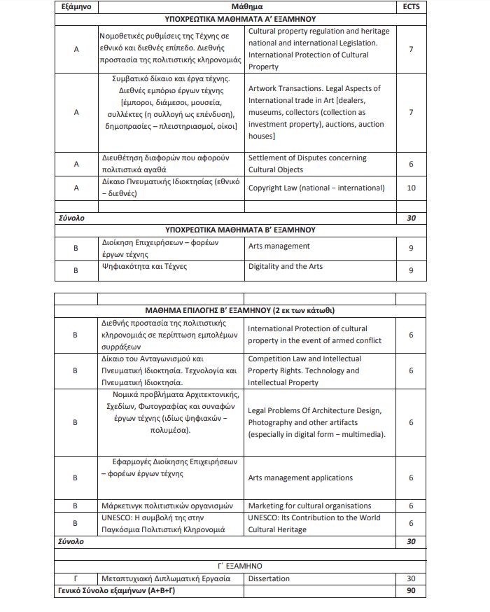 - Η απόκτηση εξειδικευμένων νομικών και οικονομικών γνώσεων σχετικά με τη διαμόρφωση και τη λειτουργία των αγορών που σχετίζονται με τα έργα τέχνης, την οικονομική αποτίμησή τους και την εμπορική εκμετάλλευσή τους, το management έργων τέχνης.