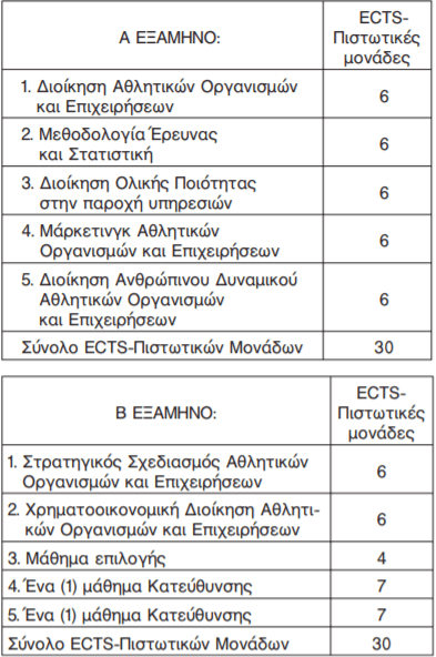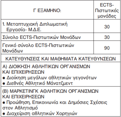 (γ) Οικονομική διαχείριση αθλητικών οργανισμών και επιχειρήσεων.Η χρονική διάρκεια φοίτησης στο Π.Μ.Σ. για τη λήψη Διπλώματος Μεταπτυχιακών Σπουδών (Δ.Μ.Σ.) ορίζεται σε τρία (3) ακαδημαϊκά εξάμηνα και απαιτείται η παρακολούθηση και επιτυχής εξέταση σε δέκα (10) μαθήματα κατά τη διάρκεια δύο διδακτικών εξαμήνων, καθώς και η εκπόνηση Μεταπτυχιακής Διπλωματικής Εργασίας κατά τη διάρκεια του 3ου εξαμήνου. Τα μαθήματα πραγματοποιούνται χρησιμοποιώντας την δια ζώσης εκπαίδευση (που περιλαμβάνει 65% των συνολικών ωρών διδασκαλίας) και τη μέθοδο της σύγχρονης εξ’ αποστάσεως εκπαίδευσης (που περιλαμβάνει 35% των συνολικών ωρών διδασκαλίας). Στο Π.Μ.Σ. γίνονται δεκτοί πτυχιούχοι Τμημάτων Πανεπιστημίων της ημεδαπής και αναγνωρισμένων ομοταγών Ιδρυμάτων της αλλοδαπής και πτυχιούχοι Τμημάτων ΤΕΙ συναφούς γνωστικού αντικειμένου.