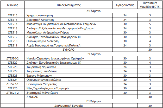 - ΜΒΑ-Tourism Management, πλήρους φοίτησης, διάρκειας 3 εξαμήνων