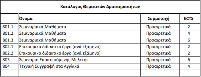 Ο Κατάλογος αυτός, όπως και ο παραπάνω των Θεματικών Δραστηριοτήτων, είναι δυνατόν να τροποποιηθεί με απόφαση της Συνέλευσης του Τμήματος. Αναπροσαρμόζεται και συγκεκριμενοποιείται ανά Ακαδημαϊκό Έτος με απόφαση της Συνέλευσης του Τμήματος.