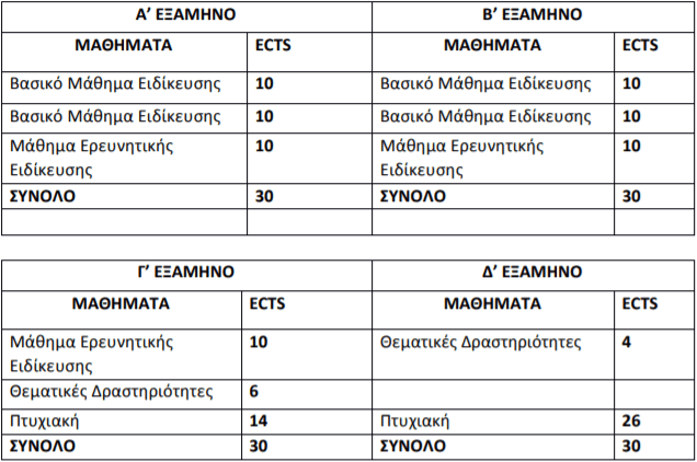 • Το σύνολο των Πιστωτικών Μονάδων (ECTS) που απαιτούνται για την απονομή του Δ.Μ.Σ. ανέρχονται σε 120.