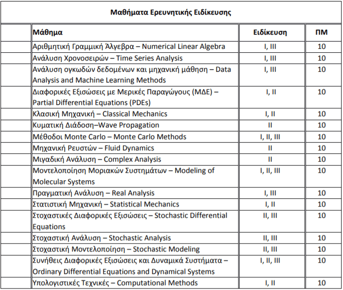 Στον παρακάτω πίνακα παρατίθεται ενδεικτικός κατάλογος Βασικών Μαθημάτων Ειδίκευσης και Μαθημάτων Ερευνητικής Ειδίκευσης για τις 3 διαφορετικές ειδικεύσεις. Κάθε Βασικό μάθημα εντάσσεται σε μία η περισσότερες ειδικεύσεις όπως φαίνεται στον πίνακα. Για κάθε Μάθημα Ερευνητικής Ειδίκευσης σημειώνεται η ειδίκευση στην οποία το μάθημα αυτό είναι προτεινόμενο, αλλά είναι δυνατόν το κάθε μάθημα να ενταχθεί στο πρόγραμμα του φοιτητή για κάθε Ειδίκευση.