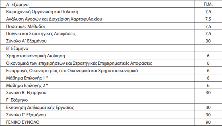 β. Περιλαμβάνει επτά (7) υποχρεωτικά μαθήματα εκ των οποίων τα τέσσερα (4) στο α΄ εξάμηνο με επτάμιση (7,5) πιστωτικές μονάδες έκαστο και τα τρία (3) στο β΄ εξάμηνο με έξι (6) πιστωτικές μονάδες έκαστο, δύο μαθήματα επιλογής στο β΄ εξάμηνο με έξι (6) πιστωτικές μονάδες έκαστο και τη συγγραφή διπλωματικής εργασίας στο γ΄ εξάμηνο με τριάντα (30) πιστωτικές μονάδες.