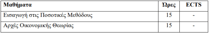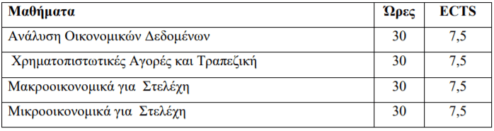 - Το Π.Μ.Σ. «Εφαρμοσμένα Οικονομικά» περιλαμβάνει δύο (2) περιόδους διδασκαλίας μαθημάτων και μία (1) περίοδο εκπόνησης της μεταπτυχιακής διπλωματικής εργασίας. Για την απόκτηση του Δ.Μ.Σ. απαιτούνται εβδομήντα πέντε (75) ευρωπαϊκές πιστωτικές μονάδες (ECTS), εκ των οποίων τριάντα (30) στα τέσσερα (4) μαθήματα κορμού στην 1η περίοδο διδασκαλίας, τριάντα (30) στα τέσσερα μαθήματα στη 2η περίοδο διδασκαλίας (δύο (2) υποχρεωτικά και δύο (2) επιλογής μαθήματα κατεύθυνσης) και δεκαπέντε (15) στη μεταπτυχιακή διπλωματική εργασία στη θερινή περίοδο εκπόνησης της. - Επιπλέον, δίνεται η δυνατότητα διδασκαλίας, μετά από εισήγηση της ΣΕ και απόφαση της Συνέλευσης του Τμήματος Οικονομικών Επιστημών δύο προαιρετικών μαθημάτων υποβάθρου με τίτλο «Εισαγωγή στις Ποσοτικές Μεθόδους» και «Αρχές Οικονομικής Θεωρίας», σε περίπτωση που σημαντικός αριθμός των φοιτητών του τμήματος δεν έχει το απαραίτητο υπόβαθρο στην Οικονομική Επιστήμη. Η παρακολούθηση των μαθημάτων αυτών είναι προαιρετική και τα μαθήματα αυτά δεν λαμβάνουν πιστωτικές μονάδες και δεν προσμετρούνται στην απόκτηση του Δ.Μ.Σ.. - Α) Προπαρασκευαστικά μαθήματα υποβάθρου  - Β) 1η Διδακτική Περίοδος (χειμερινή περίοδος):  - Γ) 2η Διδακτική Περίοδος (εαρινή περίοδος):