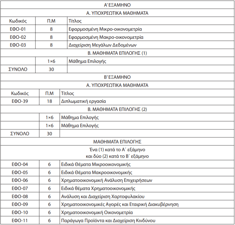 • Το πρόγραμμα μεταπτυχιακών σπουδών (Π.Μ.Σ.) έχει ως γνωστικό αντικείμενο την Εφαρμοσμένη Οικονομική και την Ανάλυση Δεδομένων ευρύτερου οικονομικού ενδιαφέροντος καλύπτοντας τόσο το θεωρητικό όσο και το εφαρμοσμένο περιεχόμενο αυτής.