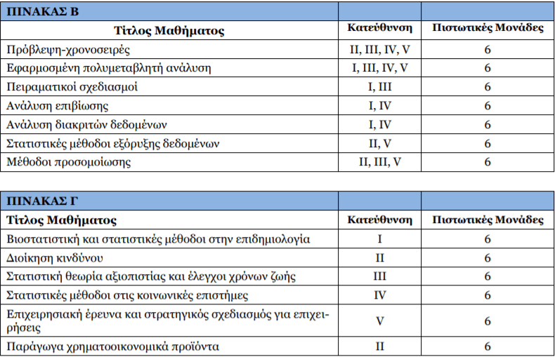 – Στατιστικές Μέθοδοι στον Επιχειρηματικό Σχεδιασμό (Statistical Methods in Business Planning -Business Analytics)Για την απόκτηση του Δ.Μ.Σ. απαιτείται η επιτυχής παρακολούθηση δώδεκα (12) μεταπτυχιακών μαθημάτων εκ των οποίων τρία (3) είναι υποχρεωτικά και εννέα (9) είναι επιλογής, καθώς και η συγγραφή διπλωματικής εργασίας. Σε όλα τα μαθήματα πραγματοποιείται εργαστηριακή εξάσκηση με χρήση στατιστικών ή μαθηματικών πακέτων όπως SAS, SPSS, R, Mathematica, κ.ά.