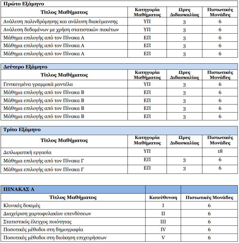 – Στατιστικές Μέθοδοι στον Επιχειρηματικό Σχεδιασμό (Statistical Methods in Business Planning -Business Analytics)Για την απόκτηση του Δ.Μ.Σ. απαιτείται η επιτυχής παρακολούθηση δώδεκα (12) μεταπτυχιακών μαθημάτων εκ των οποίων τρία (3) είναι υποχρεωτικά και εννέα (9) είναι επιλογής, καθώς και η συγγραφή διπλωματικής εργασίας. Σε όλα τα μαθήματα πραγματοποιείται εργαστηριακή εξάσκηση με χρήση στατιστικών ή μαθηματικών πακέτων όπως SAS, SPSS, R, Mathematica, κ.ά.