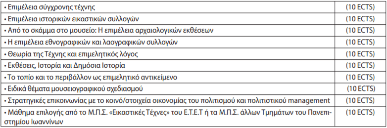 Για τη λήψη Μεταπτυχιακού Διπλώματος Ειδίκευσης (Μ.Δ.Ε.) οι φοιτητές υποχρεούνται να παρακολουθήσουν και να εξεταστούν επιτυχώς σε επτά μαθήματα για την κατεύθυνση «Εικαστικές Τέχνες» και οκτώ για την κατεύθυνση «Επιμέλεια Εκθέσεων: Θεωρητικές και πρακτικές προσεγγίσεις» κατά τα τρία πρώτα εξάμηνα. Το Δ΄ εξάμηνο διατίθεται για τη συγγραφή της διπλωματικής εργασίας ειδίκευσης και την επιτυχή εξέταση του φοιτητή σε αυτή και πιστώνεται με τριάντα (30) πιστωτικές μονάδες ECTS. Το σύνολο των πιστωτικών μονάδων ECTS που απαιτούνται για την απονομή του Μ.Δ.Ε. ανέρχονται σε εκατόν είκοσι (120).