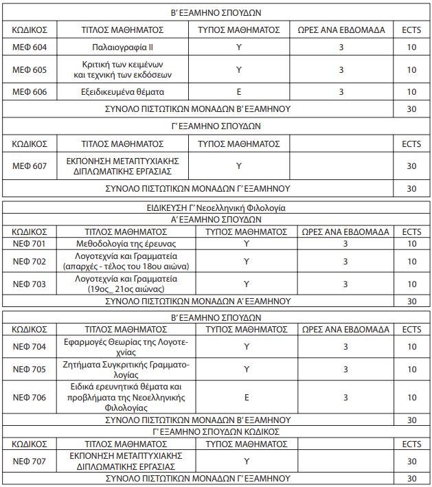 Οι πιστωτικές μονάδες του κάθε μαθήματος είναι 10, ενώ της μεταπτυχιακής διπλωματικής εργασίας (Μ.Δ.Ε.) είναι 30 σύμφωνα με το άρθρο 14 του ν. 3374/2005. Κάθε ECTS αντιστοιχεί σε 25 ώρες φόρτου εργασίας. Η γλώσσα της διδασκαλίας των μαθημάτων είναι η ελληνική. Η γλώσσα εκπόνησης της διπλωματικής εργασίας είναι η ελληνική ή, με σύμφωνη γνώμη της Τριμελούς Εξεταστικής Επιτροπής και με απόφαση της Συνέλευσης του Τμήματος, δύναται να είναι η αγγλική, γαλλική, γερμανική, ισπανική, ιταλική.