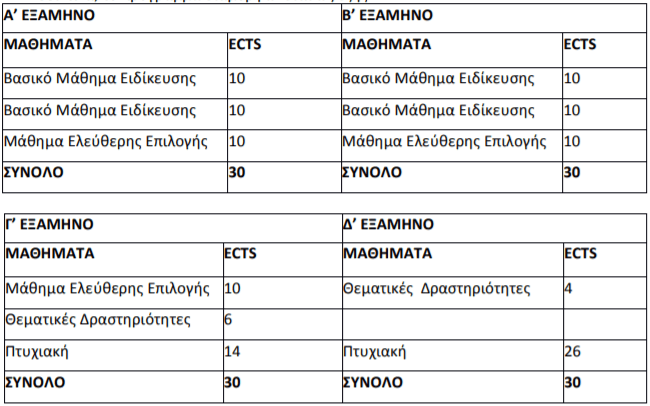 Το σύνολο των Πιστωτικών Μονάδων (ECTS) που απαιτούνται για την απονομή του Διπλώματος Μεταπτυχιακών Σπουδών ανέρχονται σε 120. Για την λήψη του Δ.Μ.Σ. απαιτείται η παρακολούθηση και η επιτυχής εξέταση σε τουλάχιστον έξι (6) μαθήματα καθώς και η συγγραφή μεταπτυχιακής εργασίας στην περιοχή ειδίκευσης, η οποία πιστώνεται με 40 ECTS. Εναλλακτικά, αντί της συγγραφής μεταπτυχιακής εργασίας, απαιτείται η παρακολούθηση και η επιτυχής εξέταση σε επί πλέον μαθήματα που αντιστοιχούν συνολικά σε 40 ECTS. Υπάρχει η δυνατότητα να ανατεθεί στους φοιτητές επικουρικό διδακτικό έργο (βοηθός διδασκαλίας, Β.Δ.) το οποίο πιστώνεται με 2 ECTS, ανά εξαμηνιαίο μάθημα, έως δύο διδακτικά εξάμηνα.