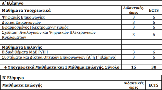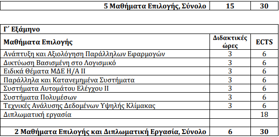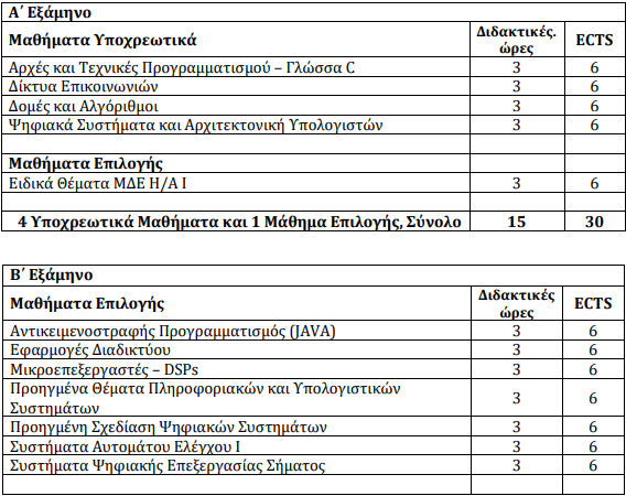 Όλα τα μαθήματα είναι ισοδύναμα, οι ώρες παρακολούθησης/εξάσκησης του καθενός είναι τρεις (3) την εβδομάδα συμπεριλαμβανόμενων τυχόν φροντιστηριακών ή/και εργαστηριακών ασκήσεων και σε κάθε μάθημα αντιστοιχούν έξι (6) ΠΜ. Η μεταπτυχιακή διπλωματική εργασία είναι υποχρεωτική και αντιστοιχούν σε αυτή δεκαοκτώ (18) ΠΜ. Το αναλυτικό περιεχόμενο του κάθε μαθήματος είναι αναρτημένο στην αντίστοιχη ιστοσελίδα για τις δύο ειδικεύσεις Ρ/Η και Η/Α.