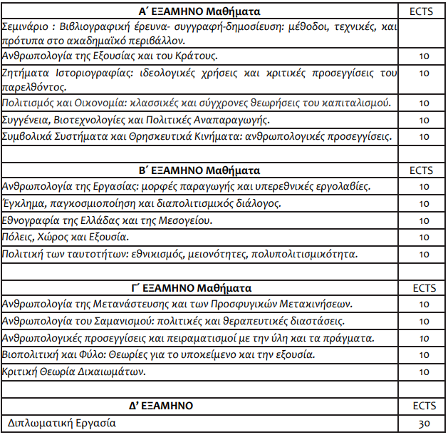 *Η ενημέρωση σχετικά με τη διαδικασία αποτελεί αποκλειστική ευθύνη των υποψηφίων.Το πρόγραμμα σπουδών του ΠΜΣ περιλαμβάνει τρία μαθήματα Ελεύθερης Επιλογής στο Α’ εξάμηνο (χειμερινό), τρία μαθήματα Ελεύθερης Επιλογής στο Β’ εξάμηνο (εαρινό) και τρία μαθήματα Ελεύθερης Επιλογής στο Γ’ εξάμηνο (χειμερινό). Κάθε μάθημα αντιστοιχεί σε δέκα πιστωτικές μονάδες. Οι φοιτητές/τριες έχουν την δυνατότητα να επιλέξουν τα τρία μαθήματα ανά εξάμηνο από τα πέντε (5) προσφερόμενα εξαμηνιαία μαθήματα. Μία εβδομάδα πριν την έναρξη των μαθημάτων του Α’ εξαμήνου όλοι/όλες οι φοιτητές/τριες οφείλουν να παρακολουθούν το Σεμινάριο διάρκειας 15 ωρών (τρεις ώρες/ημέρα) με θέμα «Βιβλιογραφική έρευνα- συγγραφή-δημοσίευση: μέθοδοι, τεχνικές, και πρότυπα στο ακαδημαϊκό περιβάλλον». Η παρακολούθηση του Σεμιναρίου είναι υποχρεωτική ωστόσο δεν προσδίδει πιστωτικές μονάδες και οι φοιτητές/τριες δεν υποχρεώνονται σε εξετάσεις.