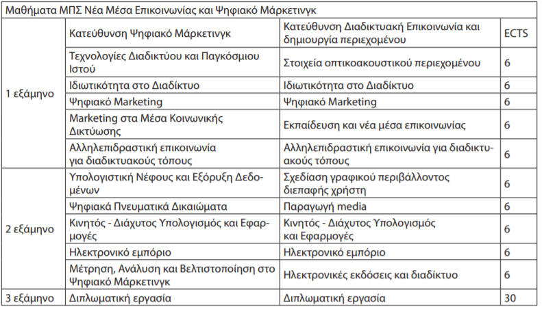 Το Πρόγραμμα Μεταπτυχιακών Σπουδών «Νέα Μέσα Επικοινωνίας και Ψηφιακό Μάρκετινγκ» (New Media Communication and Digital Marketing), έχει ως αντικείμενο την εξειδίκευση και την έρευνα σε προηγμένα ζητήματα της επιστήμης της Επικοινωνίας, των Ψηφιακών Μέσων, της Πληροφορίας και της Πληροφορικής όπως τα δίκτυα επικοινωνιών, η αλληλεπιδραστική διαδικτυακή επικοινωνία, τα μέσα κοινωνικής δικτύωσης, η επεξεργασία δεδομένων, η ψηφιακή επιχειρηματικότητα, το ψηφιακό μάρκετινγκ, τα συνεργατικά συστήματα αλλά και η ασφάλεια και η ιδιωτικότητα συστημάτων και περιεχομένου.