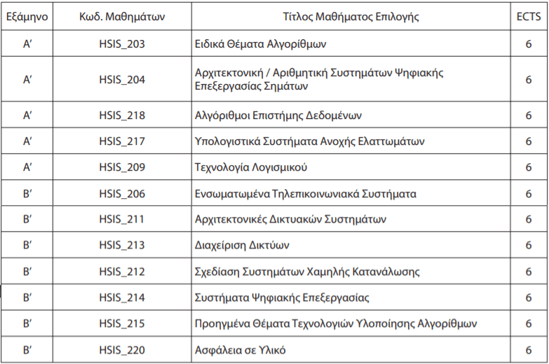 Παρατίθεται κατάλογος Μαθημάτων Επιλογής κατανεμημένων ανά προσφερόμενο εξάμηνο και αριθμό αντιστοιχούντων ECTS.