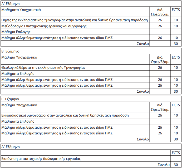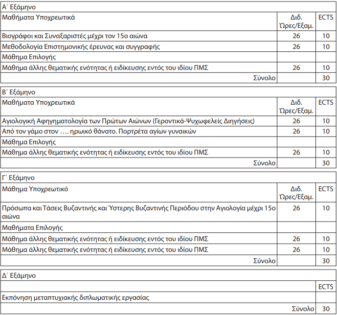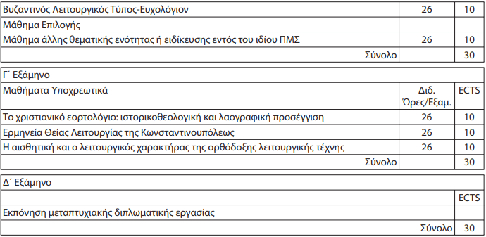Η Ειδίκευση Λειτουργική-Αγιολογία περιέχει τις Θεματικές ενότητες Α: Ιστορία και Θεολογία της Λατρείας, Β: Αγιολογία, Γ: Υμνολογία.(Θεματικές ενότητες, Πρόγραμμα μαθημάτων, Περιεχόμενο μαθημάτων και Κανονισμός Λειτουργίας) στο σύνδεσμο που ακολουθεί http://machristianity.soctheol.uoa.gr/spoydes.html )