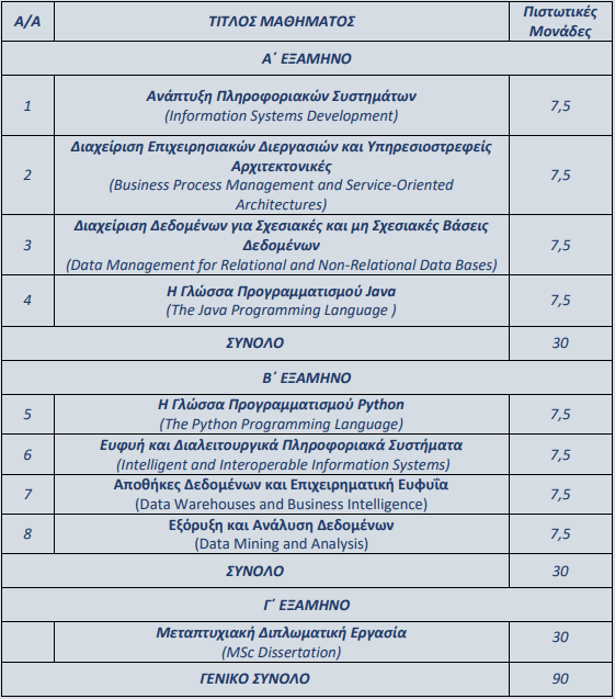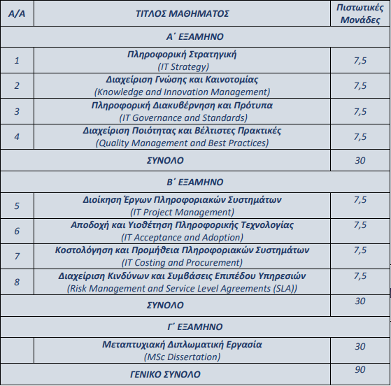 ♦ Πληροφορική Διακυβέρνηση (IT Governance)2. Το πρόγραμμα σπουδών κάθε ειδίκευσης διακρίνεται σε ακαδημαϊκά εξάμηνα και αποτελείται από ένα σύνολο σχετικών μαθημάτων και από τη μεταπτυχιακή διπλωματική εργασία (ΜΔΕ). Εκτός της θεωρητικής διδασκαλίας στους φοιτητές του ΠΜΣ παρέχονται, προαιρετικά και σε όποια μαθήματα απαιτείται, σεμιναριακά, φροντιστηριακά και εργαστηριακά μαθήματα. Επίσης, μπορεί να παρέχονται μαθήματα σε βασικά αντικείμενα πληροφορικής εκτός του προγράμματος σπουδών.
