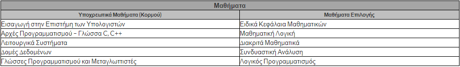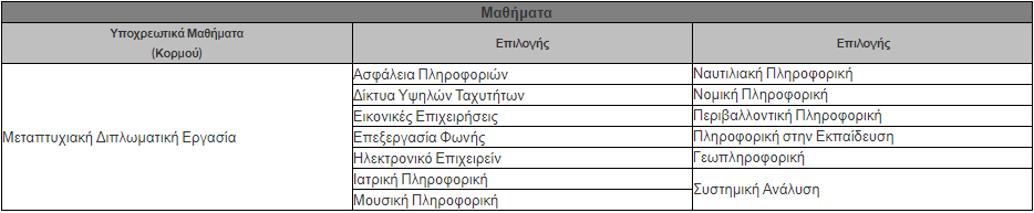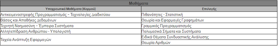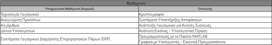 Απαιτείται η παρακολούθηση πέντε (5) µαθηµάτων κορµού και ενός (1) µαθήµατος επιλογής εκ των προσφεροµένων.
