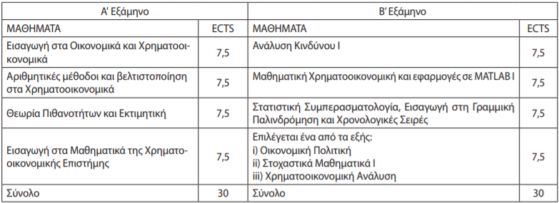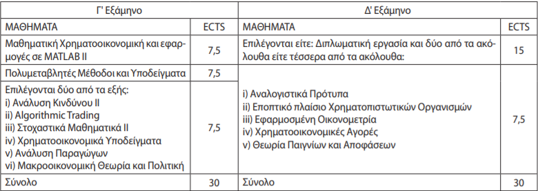 Α. «Μαθηματική Χρηματοοικονομική και Ανάλυση Κινδύνου» τέσσερα (4) συνεχή ακαδημαϊκά εξάμηνα. Για την απόκτηση ΔΜΣ απαιτούνται συνολικά εκατόν είκοσι (120) πιστωτικές μονάδες (ECTS). Η φοίτηση μπορεί να παρέχεται από πρόγραμμα μερικής φοίτησης, η συνολική διάρκεια της οποίας δεν μπορεί να υπερβαίνει τα οκτώ (8) ακαδημαϊκά εξάμηνα.