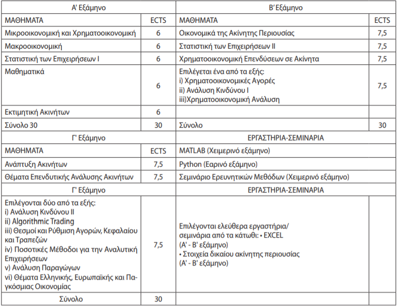 Β. «Επενδυτική και Εκτιμητική Ακινήτων» τρία (3) συνεχή ακαδημαϊκά εξάμηνα. Για την απόκτηση ΔΜΣ απαιτούνται συνολικά ενενήντα (90) πιστωτικές μονάδες (ECTS). Η φοίτηση μπορεί να παρέχεται από πρόγραμμα μερικής φοίτησης, η συνολική διάρκεια της οποίας δεν μπορεί να υπερβαίνει τα έξι (6) ακαδημαϊκά εξάμηνα.