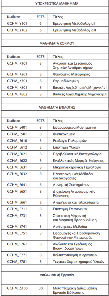 Ειδικότερα, και ανάλογα με το αν έχουν Δίπλωμα Χημικού Μηχανικού ή όχι, οι Μεταπτυχιακοί Φοιτητές (Μ.Φ.) υποχρεούνται να παρακολουθήσουν και να εξεταστούν επιτυχώς: