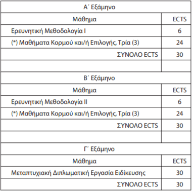 Οι Μ.Φ. υποχρεούνται πέραν των δυο μαθημάτων Ερευνητική Μεθοδολογία Ι και ΙΙ στο τέλος των δύο πρώτων εξαμήνων (Α’ και Β’) να έχουν πάρει συνολικά τουλάχιστον 2 μαθήματα κορμού και 4 μαθήματα επιλογής.