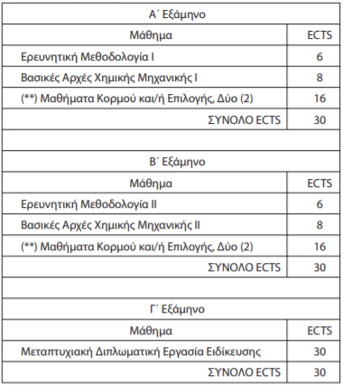 Οι Μ.Φ. υποχρεούνται πέραν των τεσσάρων μαθημάτων Ερευνητική Μεθοδολογία Ι και ΙΙ και Βασικές Αρχές Χημικής Μηχανικής Ι και ΙΙ στο τέλος των δύο πρώτων εξαμήνων (Α’ και Β’) να έχουν πάρει συνολικά τουλάχιστον 1 μάθημα κορμού και 3 μαθήματα επιλογής.