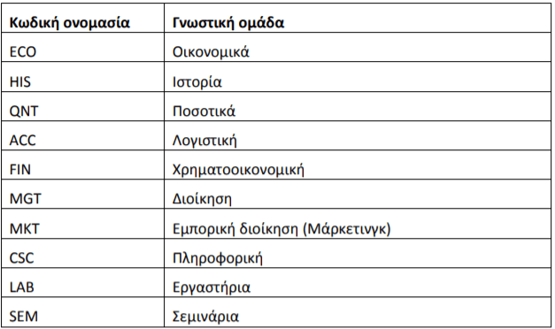 Α) Οι λατινικοί χαρακτήρες αναφέρονται στην γνωστική ομάδα που ανήκει το μάθημα. Ο πίνακας που ακολουθεί παραθέτει την κωδική ονομασία κάθε γνωστικής ομάδας του επιστημονικού αντικειμένου του Τμήματος ΔΕΟ: