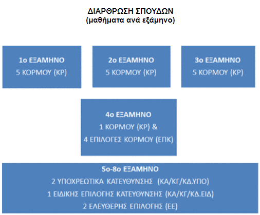 Η φοίτηση σε κάθε κύκλο σπουδών (5ο-8ο εξάμηνο) περιλαμβάνει συνολικά 8 Υποχρεωτικά Κατεύθυνσης, 4 μαθήματα Ειδικής Επιλογής και 8 μαθήματα Ελεύθερης Επιλογής.