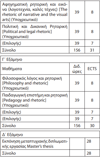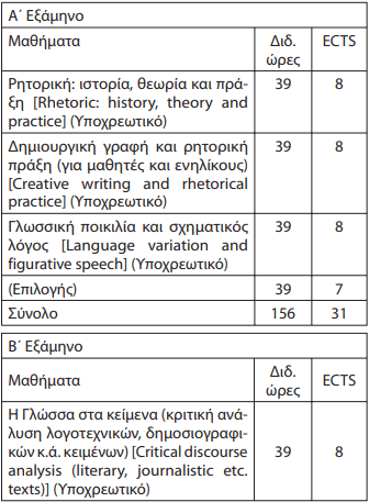 [2] παρέχει γνώσεις, αφενός σχετικά με την ιστορία της ρητορικής και την καταλυτική της επίδραση στην εξέλιξη των κοινωνικοπολιτικών και εκπαιδευτικών συστημάτων των δυτικοευρωπαϊκών χωρών, αφετέρου σχετικά με τις τεχνικές παραγωγής προφορικού και γραπτού λόγου, καθώς και ανάλυσης και παραγωγής ποικίλων πολυτροπικών κειμένων, για χρήση στα ηλεκτρονικά μέσα και στο διαδίκτυο