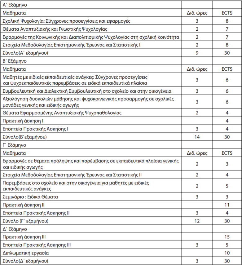• 1. Για την απόκτηση του Διπλώματος Μεταπτυχιακών Σπουδών απαιτούνται συνολικά εκατόν είκοσι (120) πιστωτικές μονάδες (ECTS) τόσο για την ειδίκευση «Σχολική Ψυχολογία», όσο και για την ειδίκευση «Εφαρμογές της Ψυχολογίας στη Σχολική Κοινότητα», οι οποίες αντιστοιχούν σε τέσσερα (4) ακαδημαϊκά εξάμηνα. Οι πιστωτικές μονάδες προέρχονται από το πρόγραμμα μαθημάτων, την πρακτική άσκηση και την εκπόνηση διπλωματικής εργασίας.