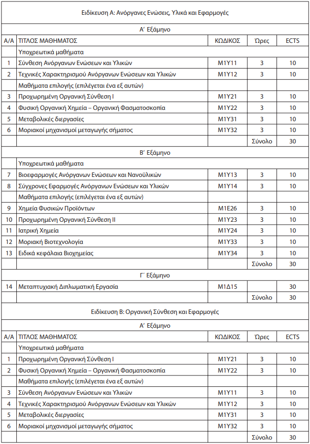 Το ΠΜΣ απονέμει Δίπλωμα Μεταπτυχιακών Σπουδών (ΔΜΣ) με τίτλο «Συνθετική Χημεία, Βιοχημεία και Εφαρμογές», στις εξής Ειδικεύσεις: