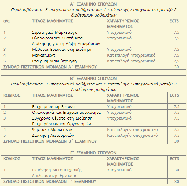 Για την απόκτηση του Δ.Μ.Σ. απαιτείται η επιτυχής εξέταση σε όλα τα μαθήματα του προγράμματος καθώς και η επιτυχής εξέταση της μεταπτυχιακής διπλωματικής εργασίας. Τα μαθήματα αντιστοιχούν σε τριάντα (30) πιστωτικές μονάδες ανά εξάμηνο σπουδών. Η διπλωματική εργασία αντιστοιχεί επίσης σε τριάντα (30) πιστωτικές μονάδες. Συνολικά απαιτείται η συμπλήρωση ενενήντα (90) πιστωτικών μονάδων.