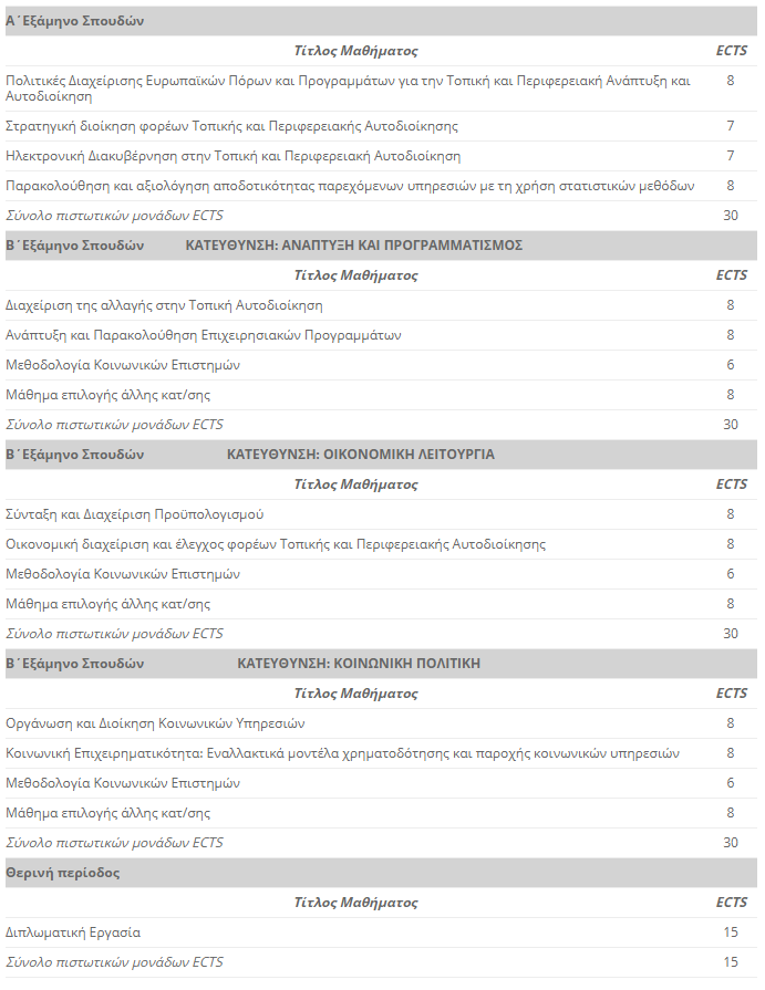 Το πρόγραμμα είναι εντατικό διάρκειας 1 έτους [δύο εξάμηνα μαθημάτων και τρίμηνη περίοδος για την εκπόνηση της διπλωματικής εργασίας] και απονέμει Δίπλωμα Μεταπτυχιακών Σπουδών (ΔΜΣ) στην «Τοπική και Περιφερειακή Ανάπτυξη και Αυτοδιοίκηση» με τις ακόλουθες ειδικεύσεις: α) Ανάπτυξη και Προγραμματισμός β) Οικονομική Λειτουργία γ) Κοινωνική Πολιτική
