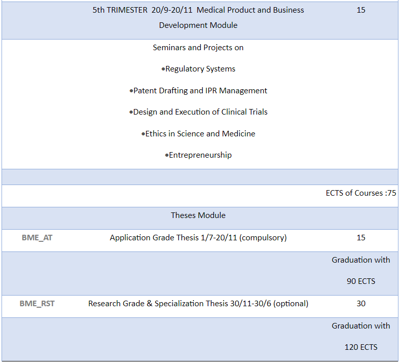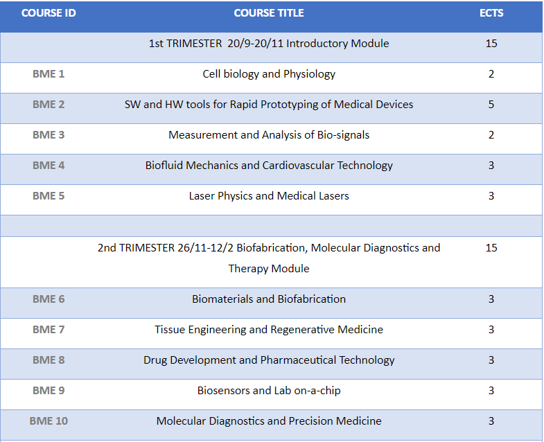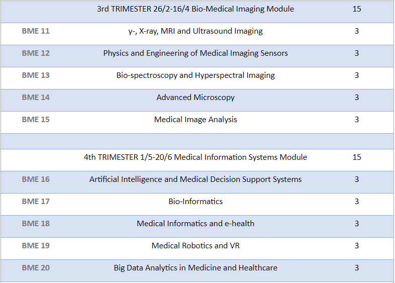• Our MSc Biomedical Engineering program is organized into five trimesters each lasting 8 weeks (lectures plus exams). The first trimester offers introductory courses with the purpose of homogenizing (up to certain point) the different educational backgrounds of the attending students.