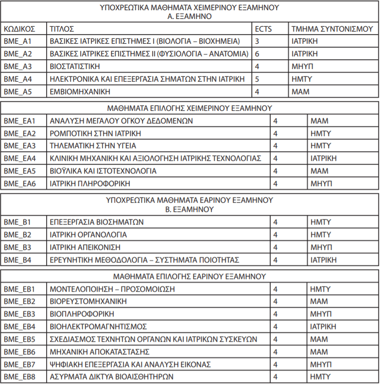 Τα διδασκόμενα μαθήματα ανά εξάμηνο, ο τίτλος (στην Ελληνική) οι αντίστοιχες πιστωτικές μονάδες ECTS και το τμήμα που συντονίζει την διδασκαλία παρουσιάζονται στον ακόλουθο πίνακα: