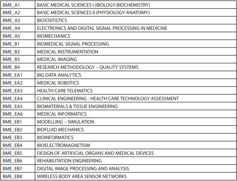 Οι τίτλοι των μαθημάτων στην αγγλική γλώσσα παρουσιάζονται στον κάτωθι πίνακα: