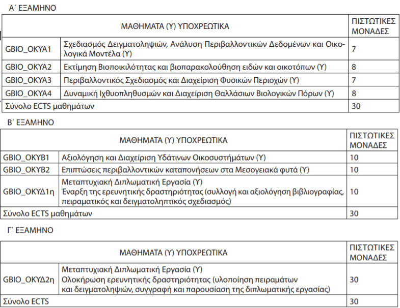Για τη λήψη του Μεταπτυχιακού Διπλώματος Ειδίκευσης (ΜΔΕ) οι φοιτητές υποχρεούνται να παρακολουθήσουν και να εξεταστούν επιτυχώς σε πέντε μαθήματα επιλογής στο Α΄ εξάμηνο, των οποίων το σύνολο είναι30 ECTS, σε τέσσερα εξαμηνιαία μαθήματα επιλογής στο Β΄ εξάμηνο, των οποίων το σύνολο είναι 20 ECTS, και να εκπονήσουν επιτυχώς την Μεταπτυχιακή Διπλωματική Εργασία κατά το Β΄ και Γ΄ εξάμηνο (Έναρξη Μεταπτυχιακής Διπλωματικής Εργασίας στο Β΄ εξάμηνο και Ολοκλήρωση Μεταπτυχιακής Διπλωματικής Εργασίας στο Γ΄ εξάμηνο). Τα μαθήματα πιστώνονται με συνολικό φόρτο εργασίας 50 ECTS και η Μεταπτυχιακή Διπλωματική Εργασία με συνολικό φόρτο εργασίας 40 ECTS.Κατεύθυνση «Εφαρμοσμένη Οικολογία – Διαχείριση Οικοσυστημάτων και Βιολογικών Πόρων»