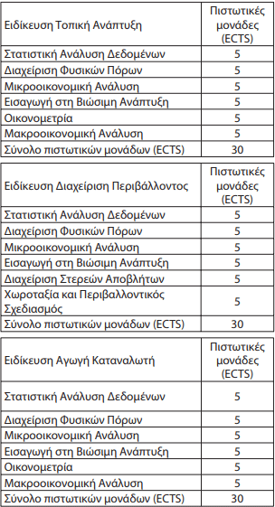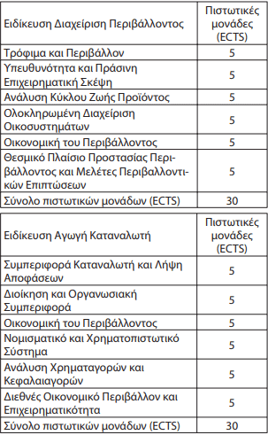 Αναλυτικά, η δομή του προγράμματος σπουδών ανά ειδίκευση καθώς και οι πιστωτικές μονάδες που αντιστοιχούν σε καθένα από τα μαθήματα είναι: