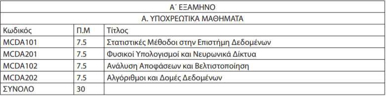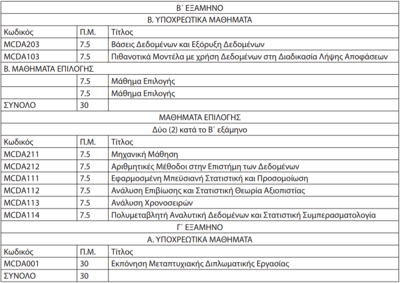 Από αυτές, τριάντα (30) μονάδες αντιστοιχούν στα τέσσερα (4) υποχρεωτικά μαθήματα του Α΄ εξαμήνου, τριάντα (30) μονάδες αντιστοιχούν στα τέσσερα (4) μαθήματα του Β΄ εξαμήνου [δύο (2) υποχρεωτικά και δύο (2) κατ’ επιλογή μαθήματα] και, τριάντα (30) μονάδες, αντιστοιχούν στην εκπόνηση της μεταπτυχιακής διπλωματικής εργασίας του Γ΄ εξαμήνου.
